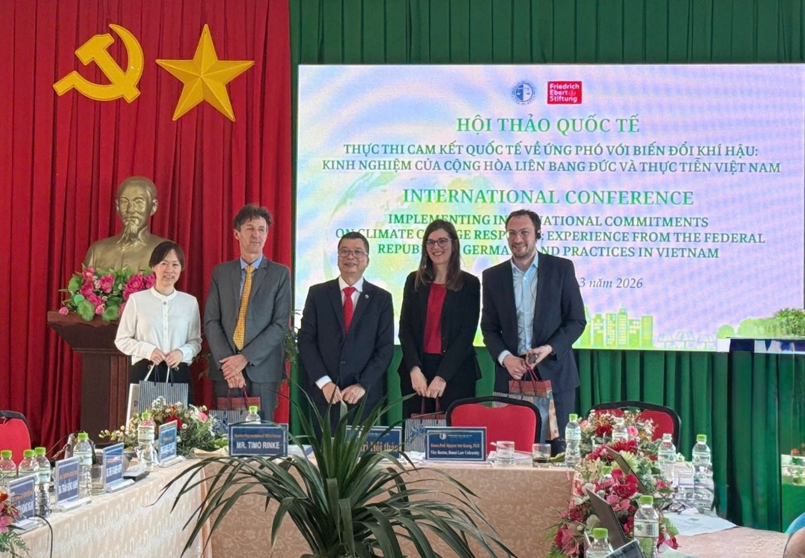 Ngày 19/03/2026, Trường Đại học Luật Hà Nội đã phối hợp với Viện FES tổ chức Hội thảo quốc tế “Thực thi cam kết quốc tế về ứng phó với biến đổi khí hậu: Kinh nghiệm của Cộng hoà liên bang Đức và thực tiễn Việt Nam” tại Phân hiệu tại Đắk Lắk của Trường Đại học Luật Hà Nội. Hội thảo do PGS.TS. Nguyễn Văn Quang, Phó Hiệu trưởng Trường Đại học Luật Hà Nội & Ông Timo Rinke – Trưởng đại diện Viện FES tại Việt Nam đồng chủ trì.